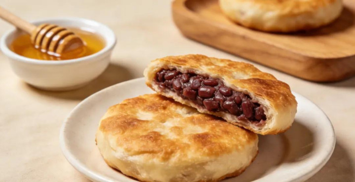 3. 平底锅刷一层薄油,倒入面糊,煎至两面金黄。在饼的一面涂上红豆沙,卷起来即可。