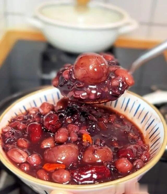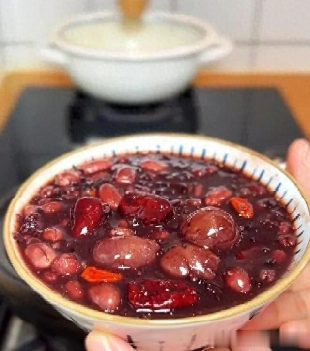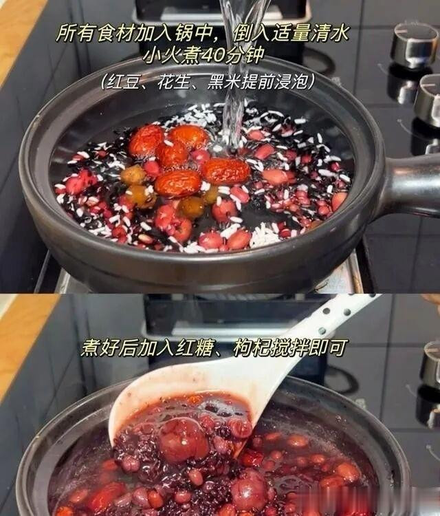 糯米15克 , 黑米15克 , 红豆30克 , 红衣花生20克 , 桂圆6颗 , 红枣5颗 , 枸杞一小把 , 红糖看个人喜好!