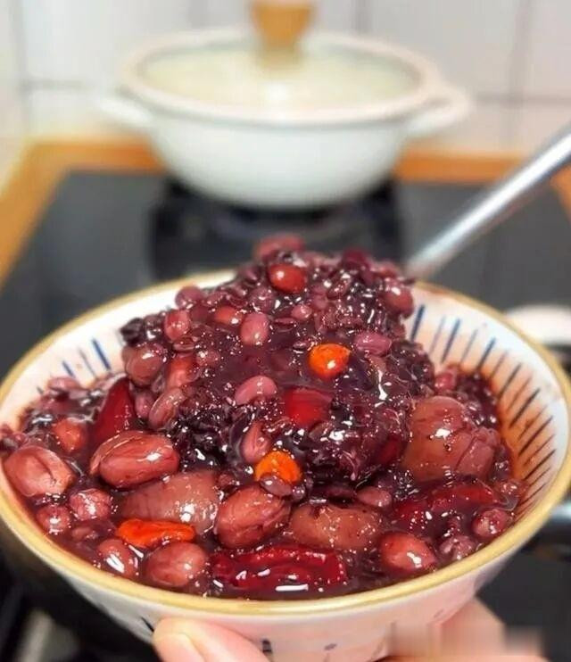 其实就是五种红色食材煮的粥 , 红豆、红枣、红衣花生、枸杞、红糖。