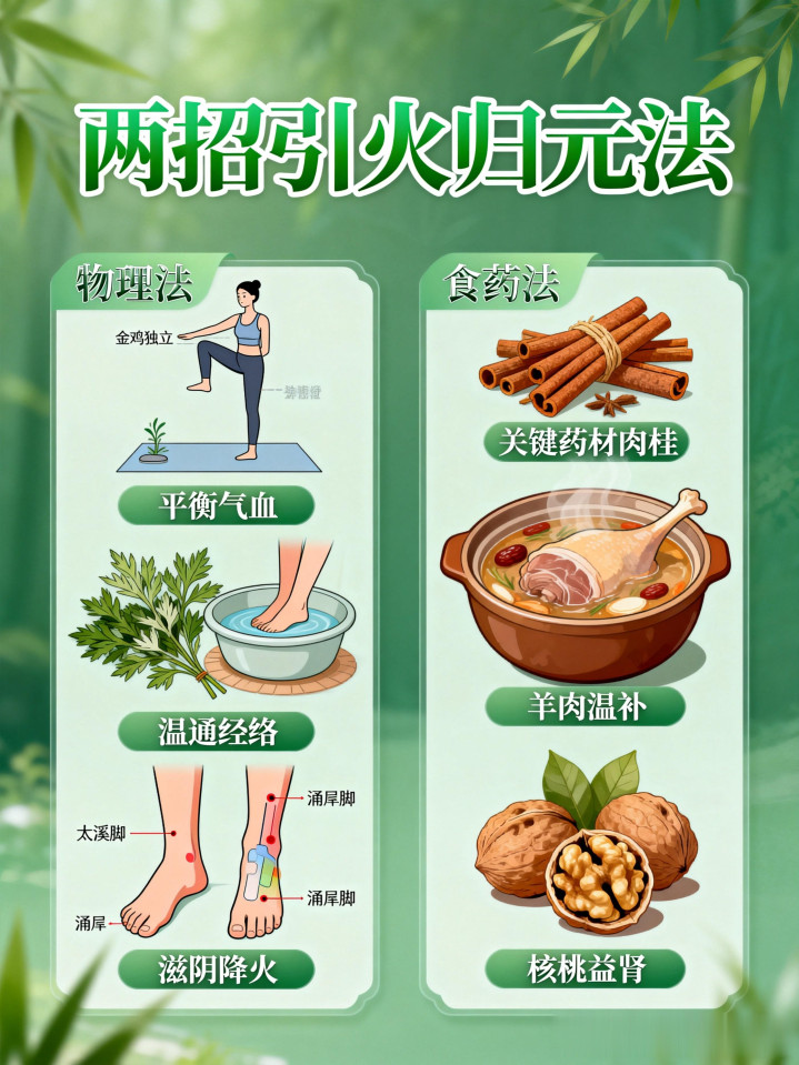 核心药材:肉桂原理: 这是“引火归元”的关键药。肉桂辛热,能“守能走”,小剂量使用时,能像一根导火索一样,把浮游的阳气引入下焦。用法: 可以在炖肉(如羊肉)时加一点肉桂,或者在医生指导下服用金匮肾气丸(含肉桂/桂枝)。