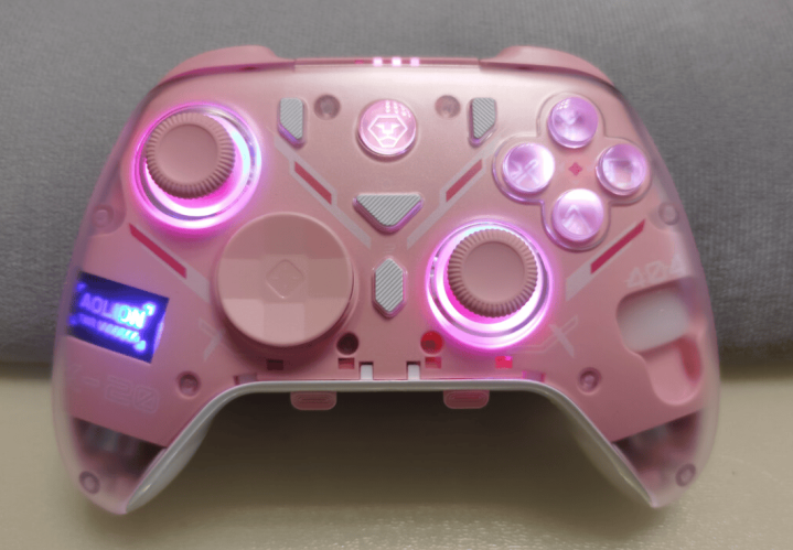 这一款在第一代基础上第二代新增了樱花少女粉;十字键做了可拆卸替换十字型或八向轮盘型,摇杆蘑菇头则依然可拆卸,附赠一对长蘑菇头,配置延承了K10的霍尔摇杆+霍尔扳机。尽管是霍尔摇杆,但依然还是上了POM耐磨环+金刚圈防止磨损。不过它的背键设计存在一定的缺陷,在操作的时候容易误触。二代升级成了机械微动,同时底部加了一层液态硅胶作填充,手感软弹的同时,又降低了微动声音,相较于手感软糯的导电胶,机械微动有着很“爽”的段落感和按键反馈。