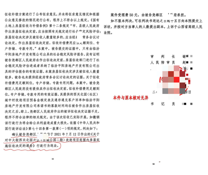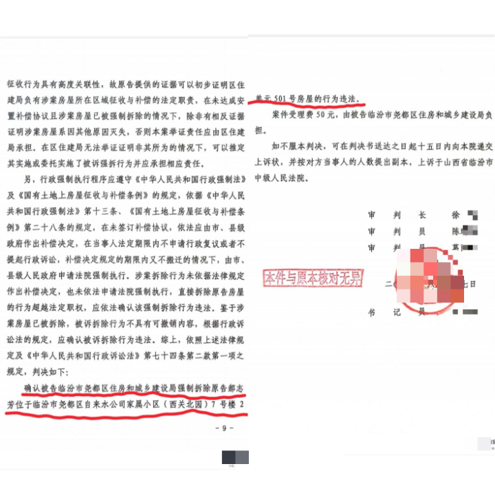 更讽刺的是,2022年5月,运城法院已作出征收行为违法的判决;2024年6月,开云app在线下载入口尧都区法院判决尧都区住建部门强拆行为违法。两份生效判决早已坐实征收与强拆的违法事实,但公安机关却对此置若罔闻,依旧坚持原有定性。