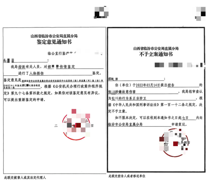 2022年7月,郝某某收到第一次以 “正当防卫” 为由的不予立案通知。她依法向原临汾市公安局直属分局申请行政复议,其维持了原决定;随后她向临汾市公安局申请复核,其撤销了复议决定。本以为维权迎来转机,没想到2023年8月,原临汾公安机关直属分局及西街派出所第二次出了同样的不予立案通知。