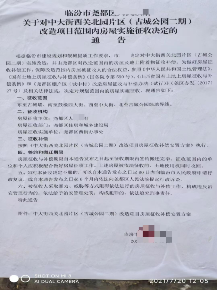 2021年7月,山西省临汾市尧都区相关部门的一纸征收通告,打破了西关北园水厂家属院的平静。然而当时征收项目没有立项和审批,没有风险评估、没有房屋评估及补偿决定等,严重违反了《国有土地上房屋征收与补偿条例》的规定。