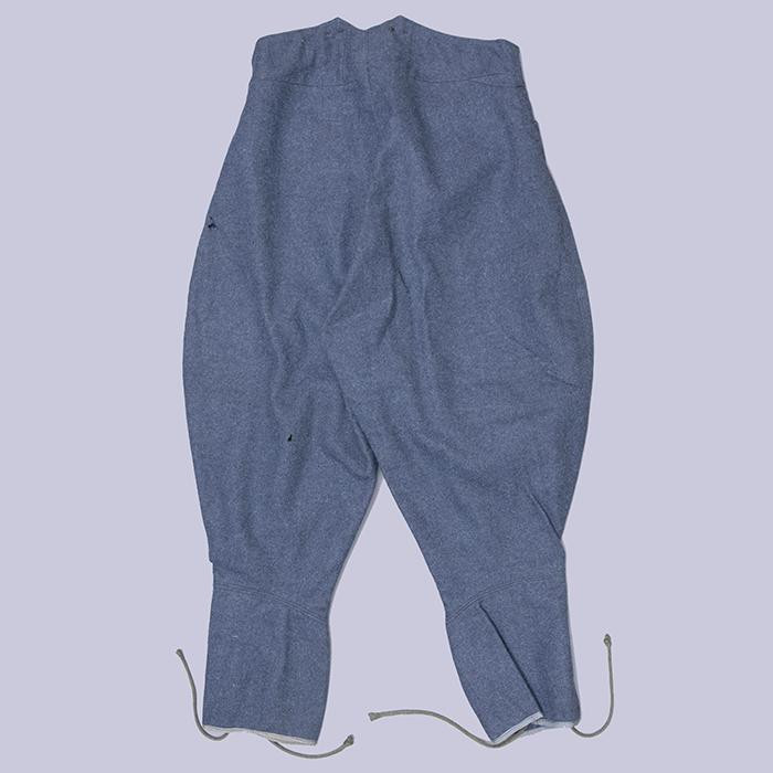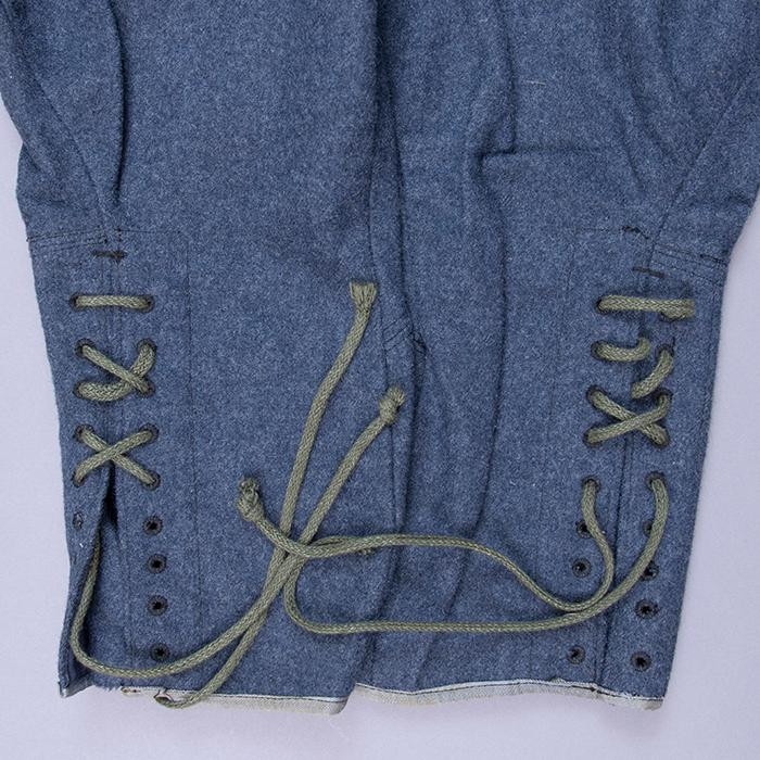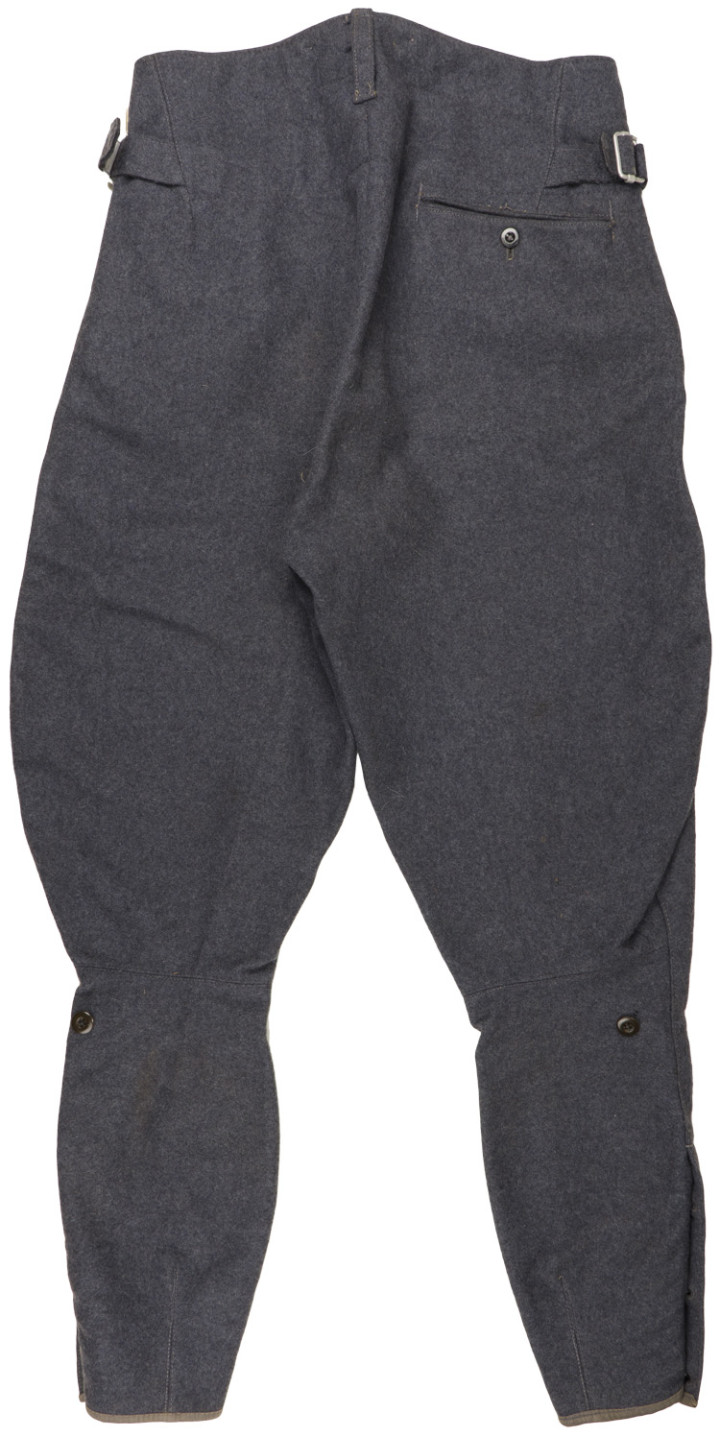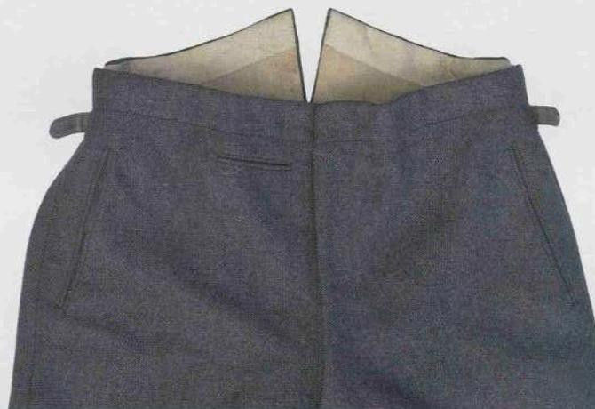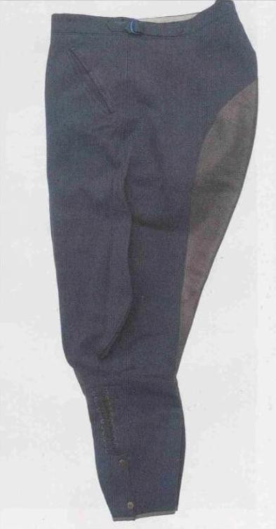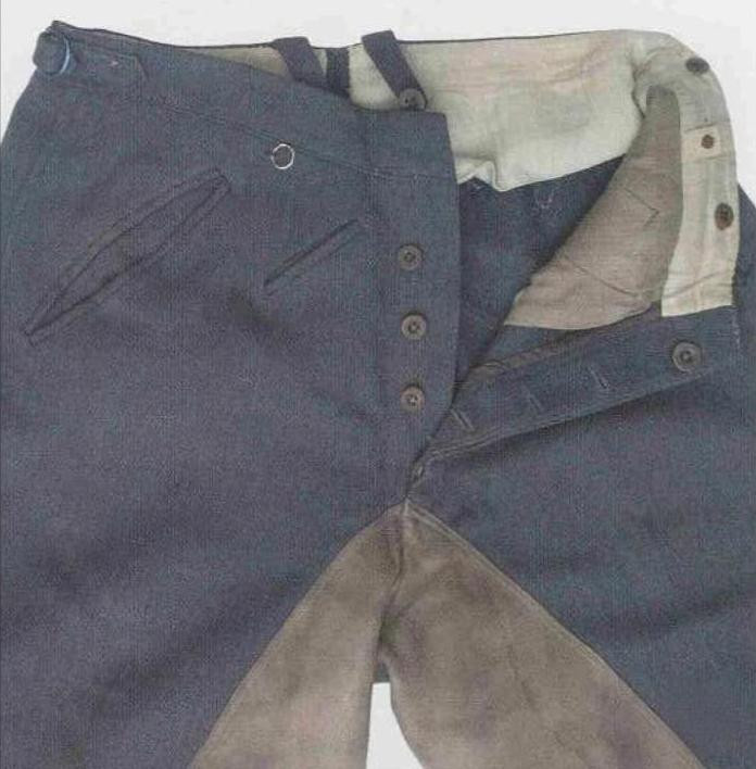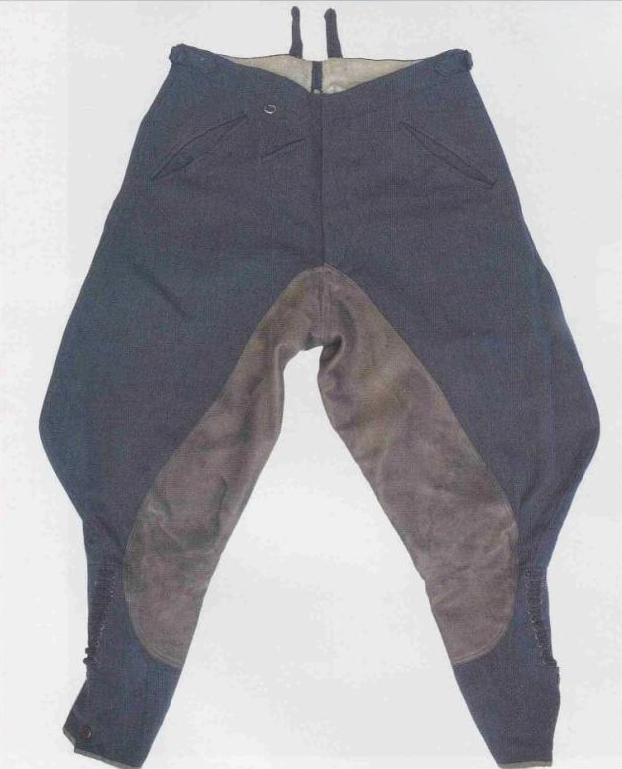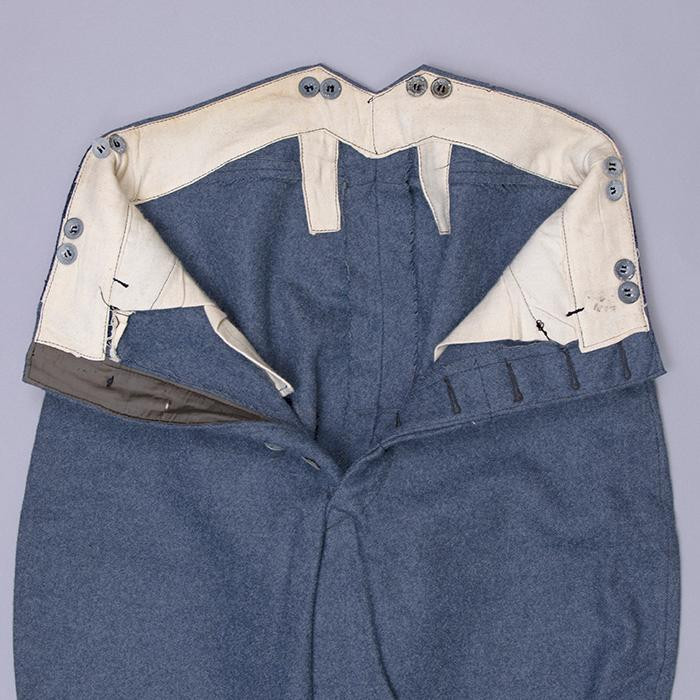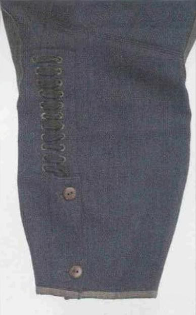 图中是一件比较常见的军官马裤,采用蓝灰色羊毛面料制成。特征是裤腰增加了布环用来固定腰带,原来固定裤背带的纽扣移到了裤腰内侧,所以这件军官马裤可以同时使用腰带裤背带。军官马裤大腿内侧没有皮革加固,为日常穿着。裤腿底部用纽扣闭合。