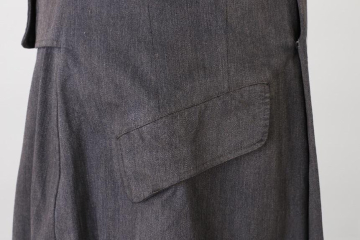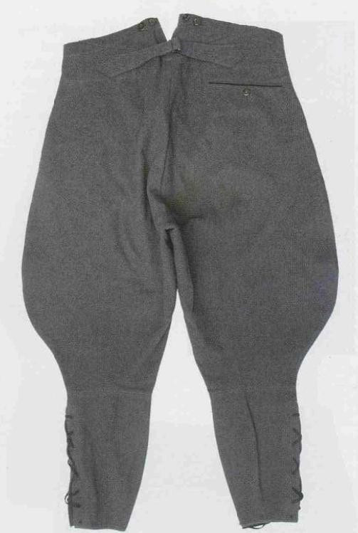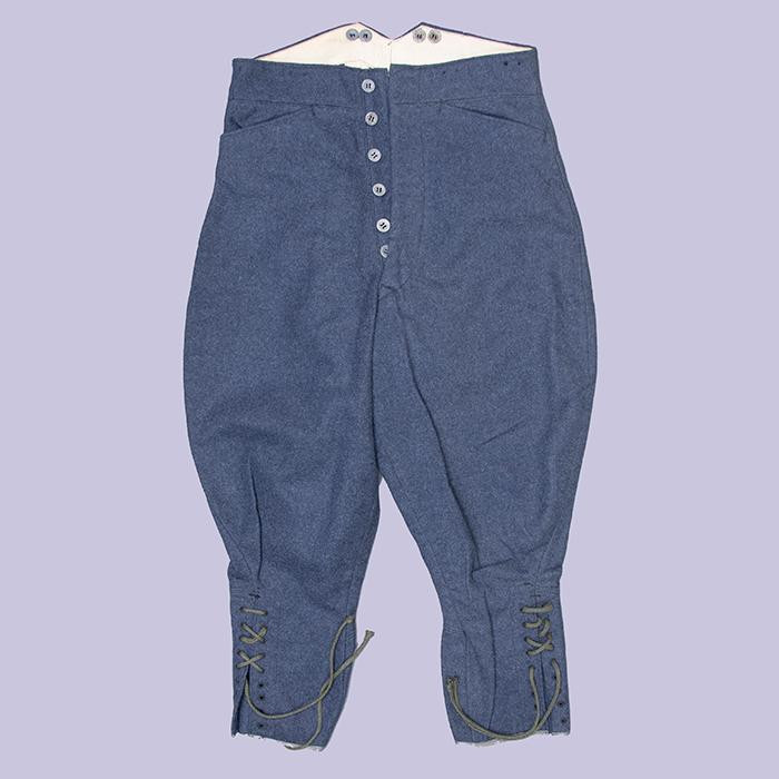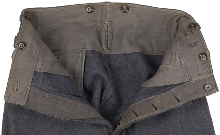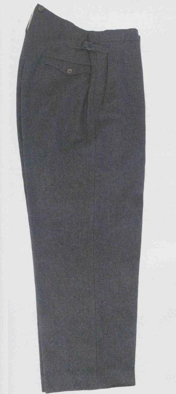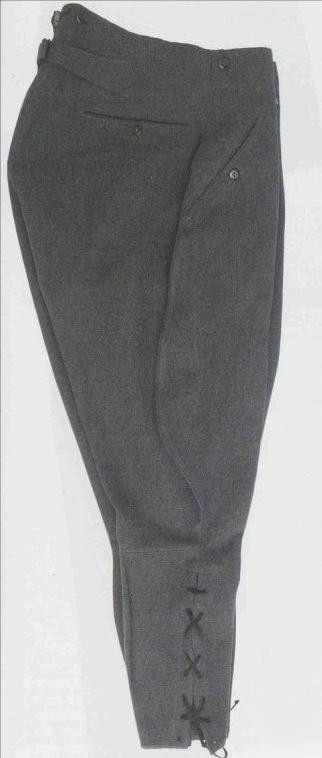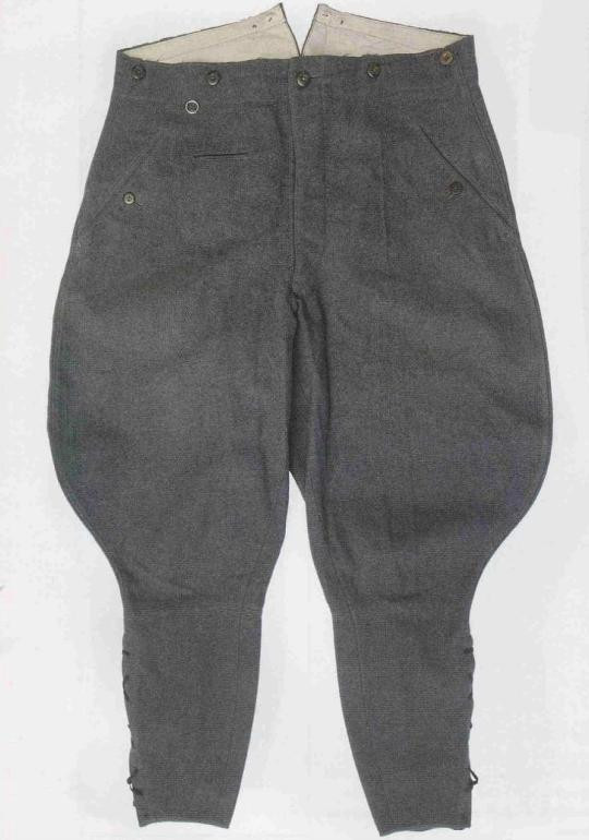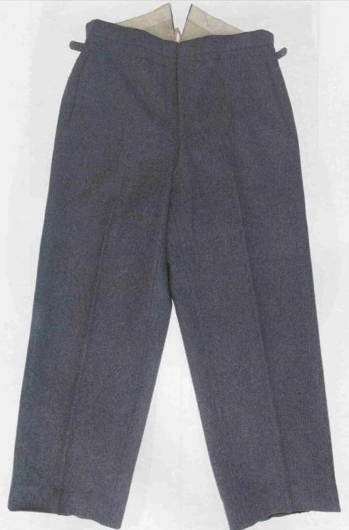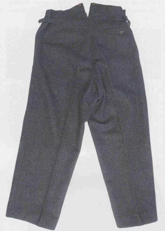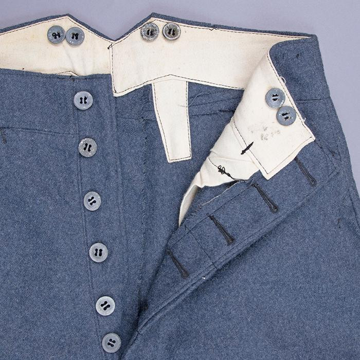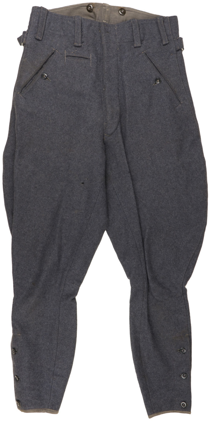 图中是一件比较常见的军官马裤,采用蓝灰色羊毛面料制成。特征是裤腰增加了布环用来固定腰带,原来固定裤背带的纽扣移到了裤腰内侧,所以这件军官马裤可以同时使用腰带裤背带。军官马裤大腿内侧没有皮革加固,为日常穿着。裤腿底部用纽扣闭合。