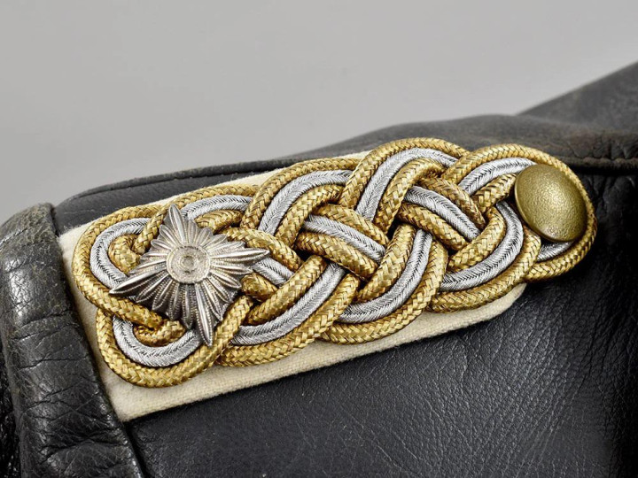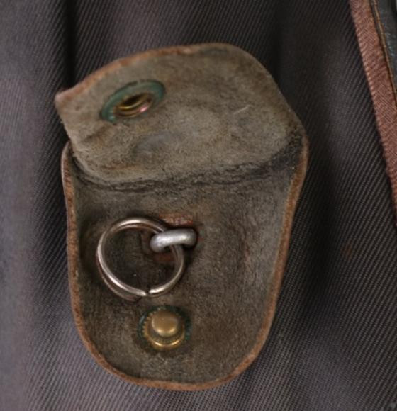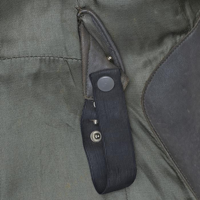 皮大衣衬里的左侧口袋上方有一条可调节弹性带用来悬挂军官佩剑。