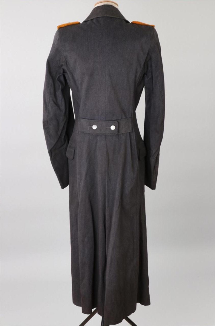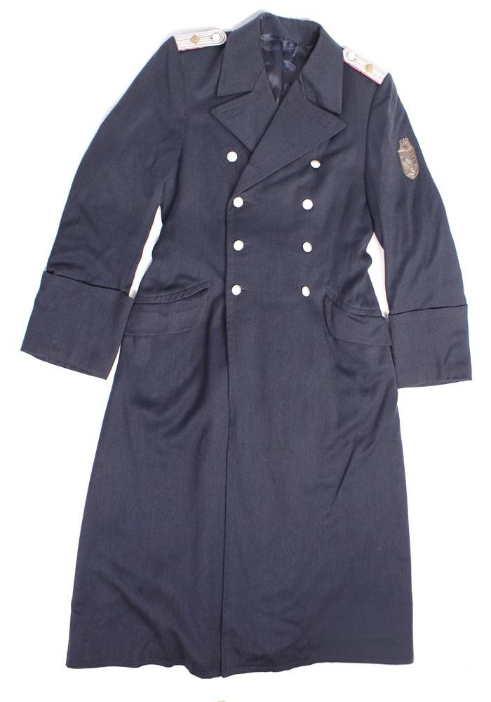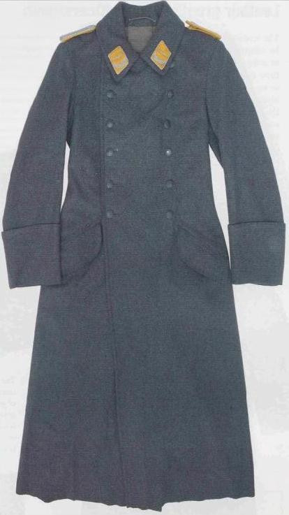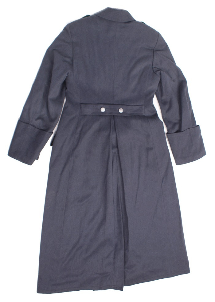 军大衣是德军中必不可少的制式服装,在寒冷和恶劣天气中,各级官兵都需要身穿军大衣。军大衣的设计来源于德意志帝国陆军的军大衣。德国空军军大衣最初是由德国航空运动联盟推出,后来被德国空军正式采用。空军军大衣的面料颜色为蓝灰色,各级官兵剪裁样式相同,二战期间只对军大衣进行了略微修改。早期生产的军大衣在左右前襟都设有扣眼,这样军大衣可以左右前襟互扣。前襟下摆两侧设金属钩,背面开衩两侧另设金属钩,腰线下方侧缝处缝制织带环,便于骑乘和行军时将下摆钩起收拢。这两项设计在1940年3月20日被废止,但实际执行并不严格。最初从士兵到军官的纽扣为银色,而将军的纽扣为金色,之后将军士和士兵的纽扣改为蓝灰色。