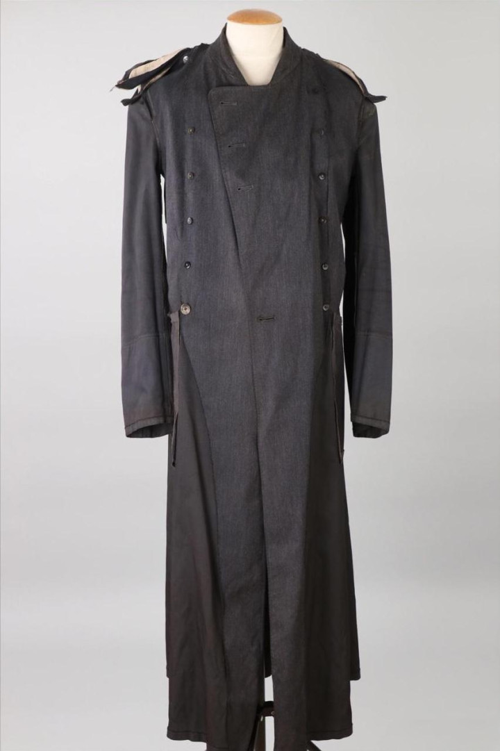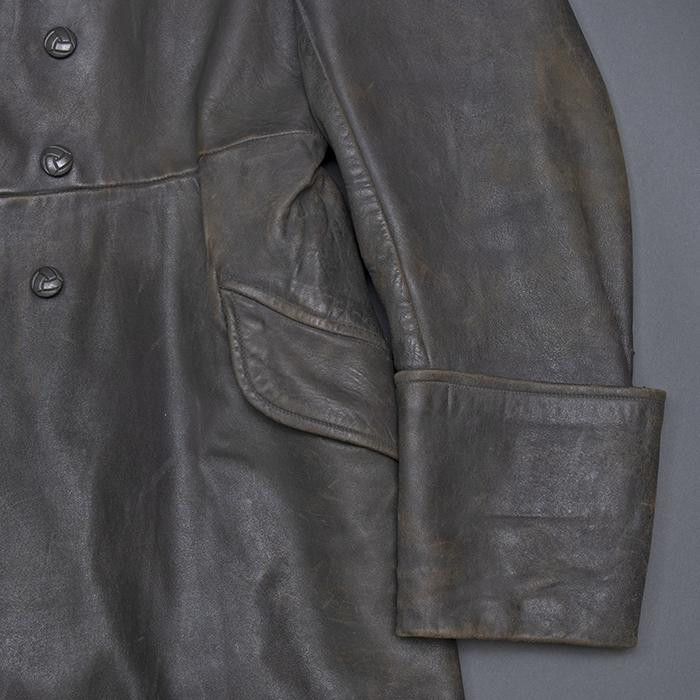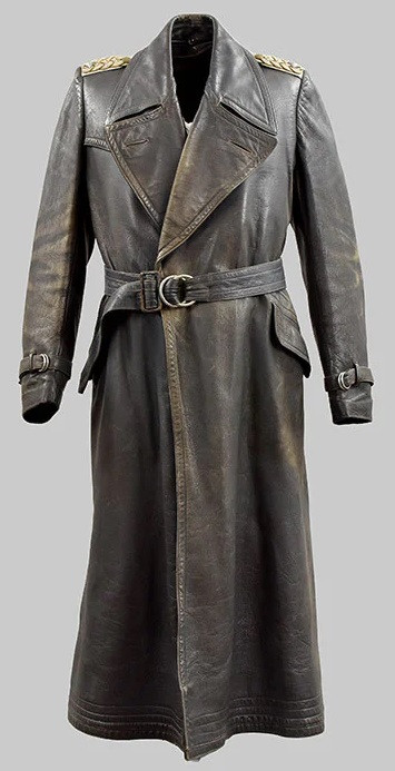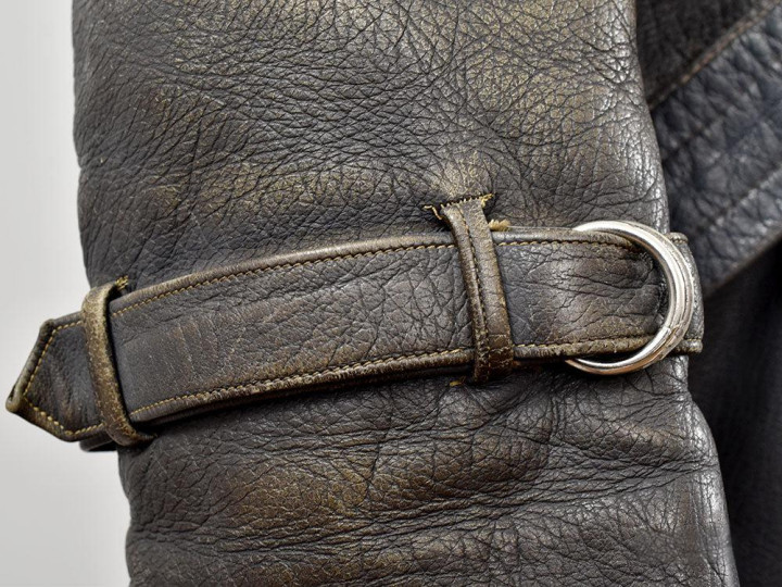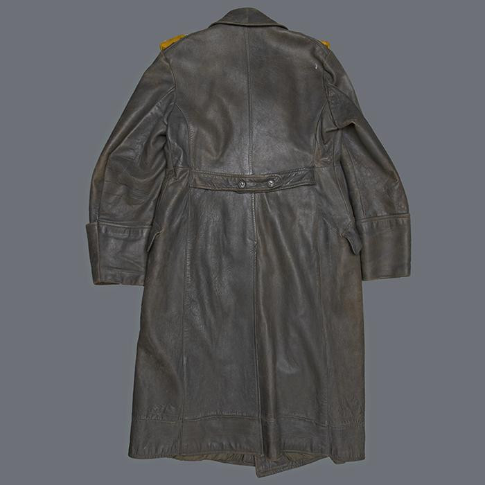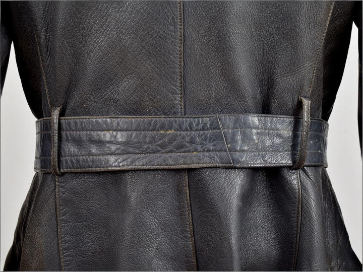 图中是一件航空兵上校皮大衣,采用高品质深灰色皮革制成,前襟双排扣,袖口为翻袖样式,髋部两个配袋盖的斜插袋,背面配两条纽扣固定的半腰带。背面腰部下方开始有垂直长开衩,开衩可用按扣闭合。
