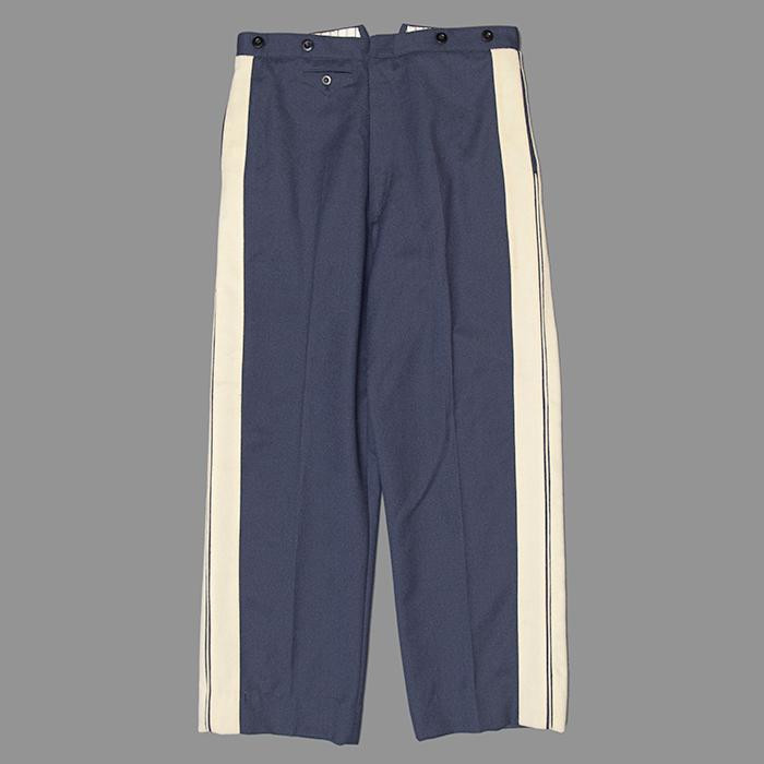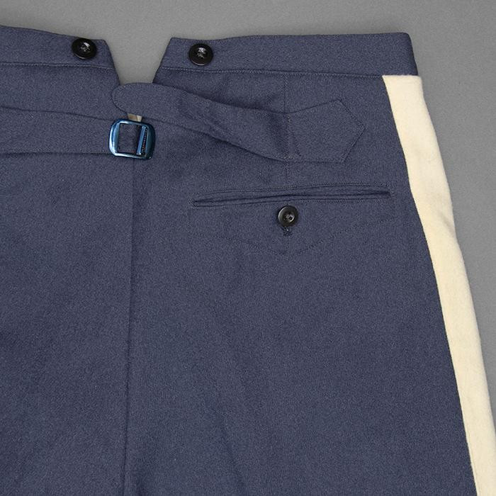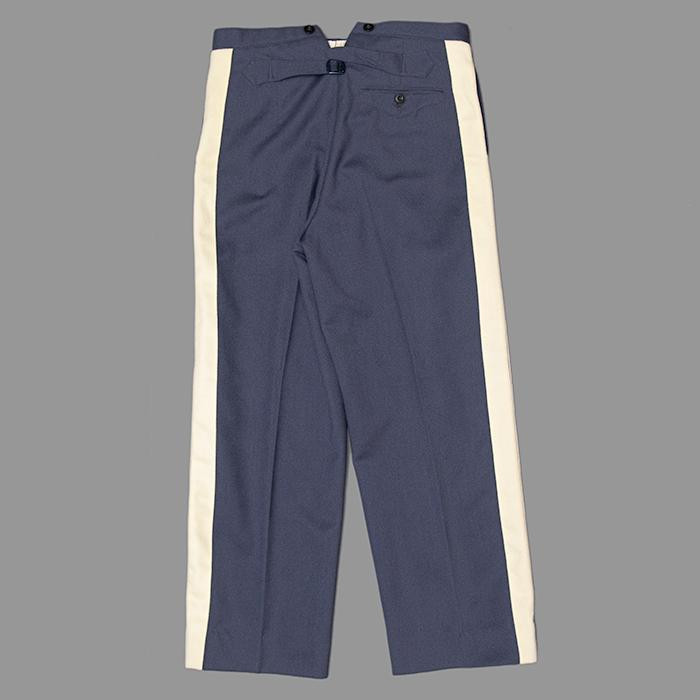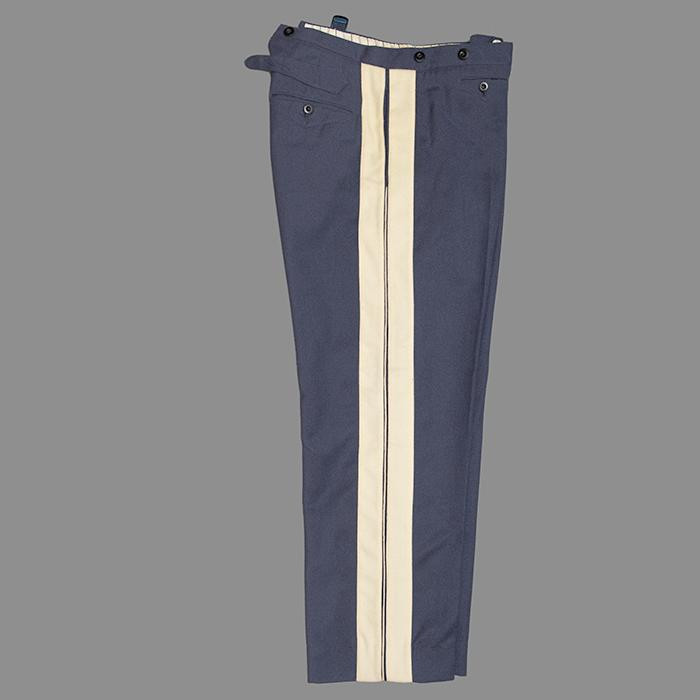 图中是一条空军将军长裤,采用蓝灰色面料羊毛制成,裤侧缝饰白色滚边,两侧饰白色镶条,均由白色羊毛制成。
