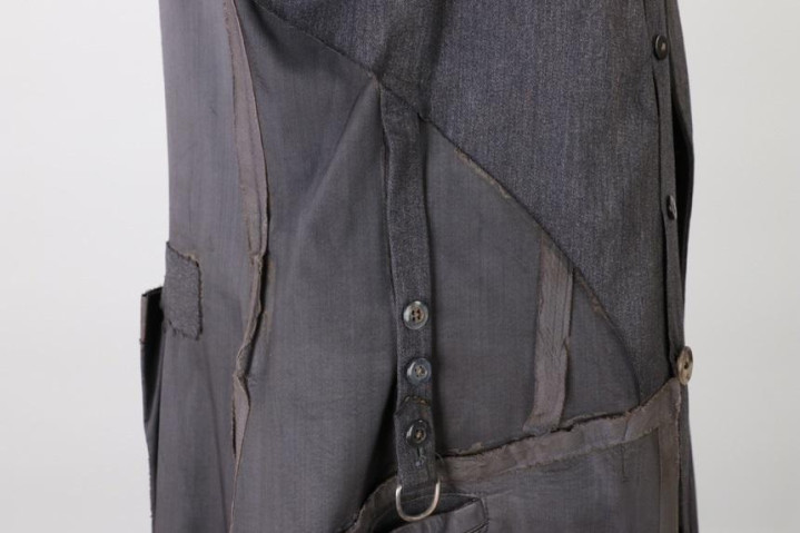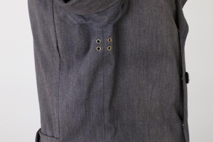 摩托车手防护大衣的背面。上背部用额外面料覆盖作为挡雨片。腰部有一条长腰带,末端缝制在腰部左侧,然后腰带沿着后腰部展开,穿过环扣后,扣合在右侧固定的三枚纽扣上。左侧腰部边缘另设一条配纽扣布带,确保左侧收腰。