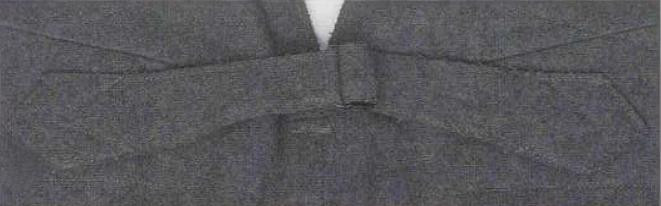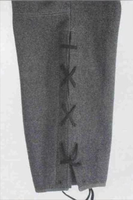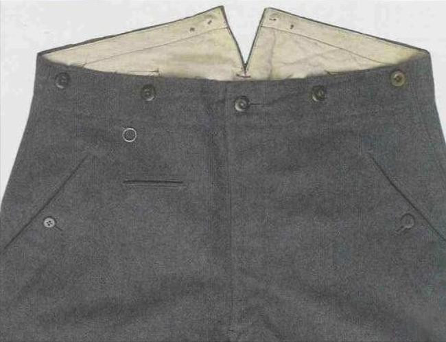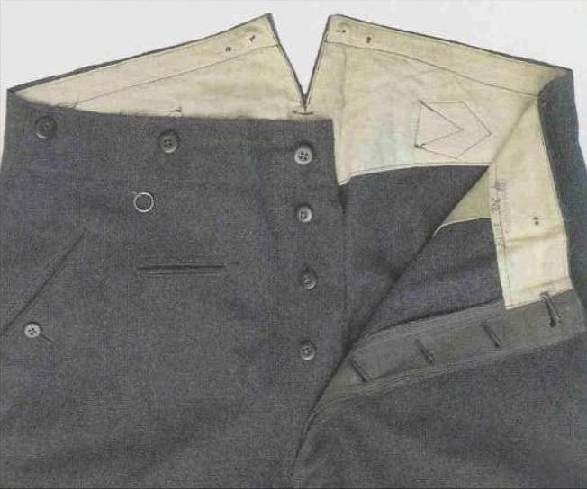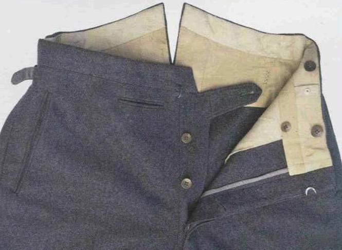 图中的长裤为自费购买款。裤腰和裤门襟样式有所不同。裤门襟纽扣都是隐藏式,并在顶部增加了一条带扣眼的布绊。裤腰上用于固定裤背带的纽扣都移到了裤腰内侧。后腰束带被裤两侧束带代替。