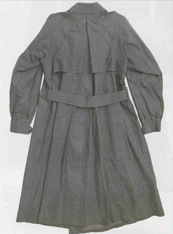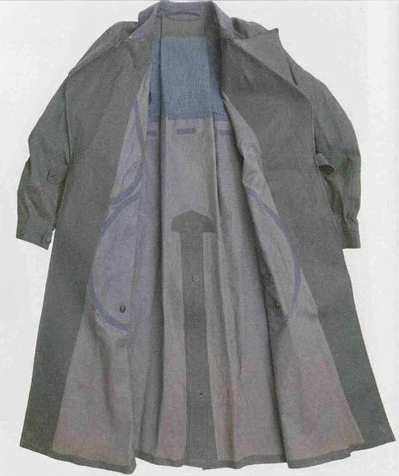 图中是一件空降兵少尉防雨大衣,采用棉斜纹布制成,表面经过橡胶涂层防水处理。防雨大衣前襟双排扣,每排六枚银色纽扣,左右前襟都有纽扣和扣眼,可以互相扣合。髋部各有一个配袋盖的斜插袋。袖子为翻袖样式,松紧不可以调节。