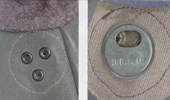 摩托车手防护大衣的腋窝下方有三个金属通风孔,通风孔背面是一个圆形金属盒,该金属盒可以旋转来开启和关闭通风孔。圆形金属盒上的“D.R.G.M”代表“Deutsches Reichsgebrauchsmuster(德国国家实用新型)”,表明已注册专利。