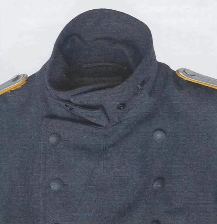 遇到恶劣天气时,可以将军大衣衣领竖起,军大衣衣领背面配有锁喉片,可以闭合竖起的衣领。