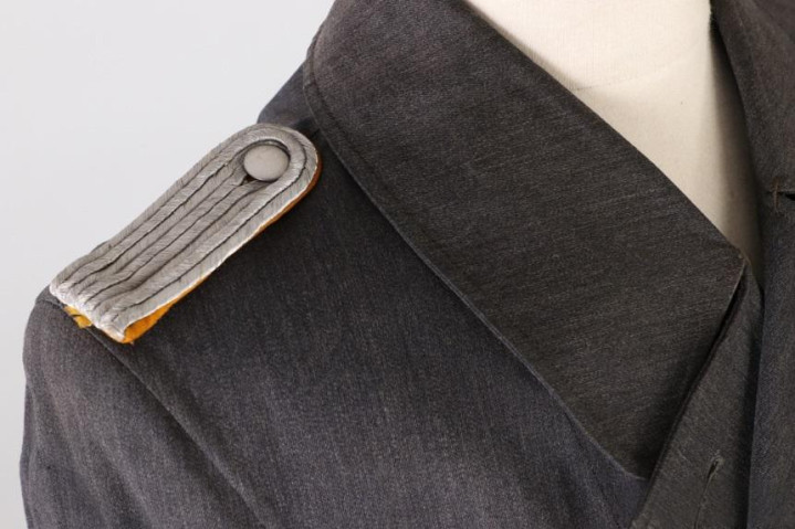 军大衣衬里采用蓝灰色丝织品,衬里为全衬里,这是和士兵军大衣主要区别。左侧还配有一条悬挂军官佩剑的金属D环。