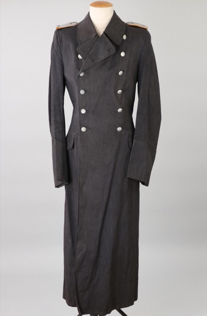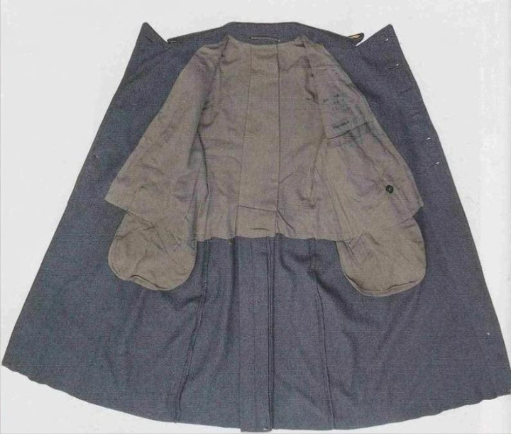 图中是一件空军文职上尉军大衣,属于自费购买,采用蓝灰色优质羊毛面料制成,左袖大臂上佩戴了纳尔维克战役臂章。