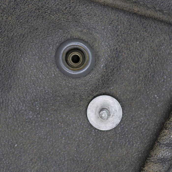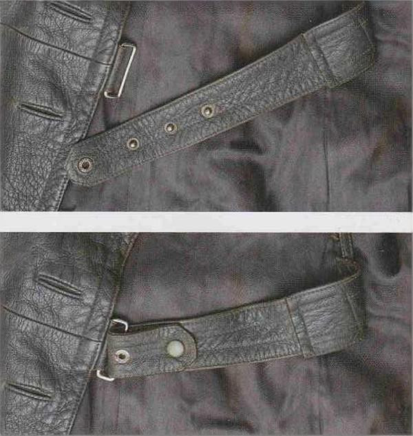 皮大衣前襟的纽扣是可拆卸的。纽扣背面的纽扣柄穿过面料后,用类似于钥匙圈的金属圈固定,然后包裹在一片皮革片中,皮革片两端用按钮折叠闭合。