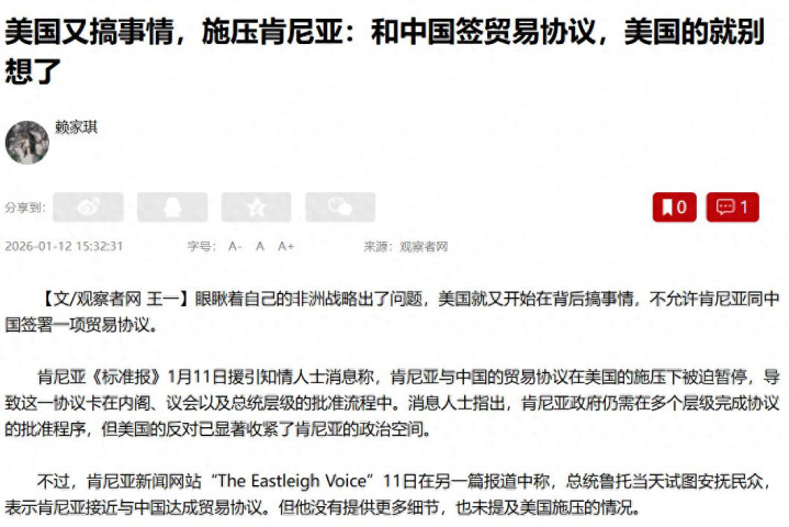 据观察者网1月12日报道,肯尼亚《标准报》1月11日援引知情人士消息称,肯尼亚与中国的贸易协议在美国的施压下被迫暂停。