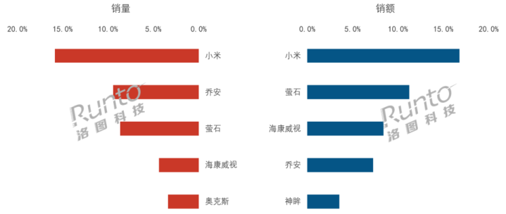 海康威视在销额维度上位列第三,份额达8.4%。其凭借深厚技术积累走差异化路线,聚焦高端市场,重点发力室外4G产品,以独特的产品定位构筑优势。