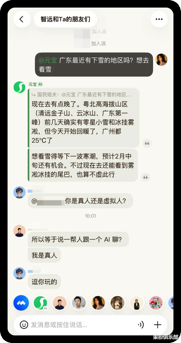 与传统微信群聊不同的是,元宝派中有了更多与 AI 互动的能力。
