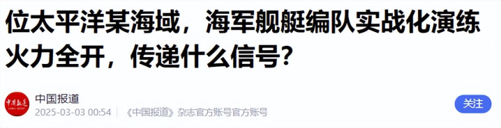 1.《位太平洋某海域,海军舰艇编队实战化演练火力全开,传递什么信号?》2025-03-03 00:54 | 来源:中国报道