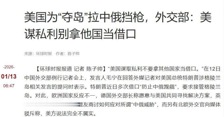 在这之前,特朗普曾多次在公开场合炒作称,中俄舰船频繁现身格陵兰岛周边,借机渲染所谓“中俄威胁”,妄图以这种虚假叙事,来服务其背后深藏的政治战略目的。一支从未出现过的舰队,被当成了吞并他国领土的挡箭牌。