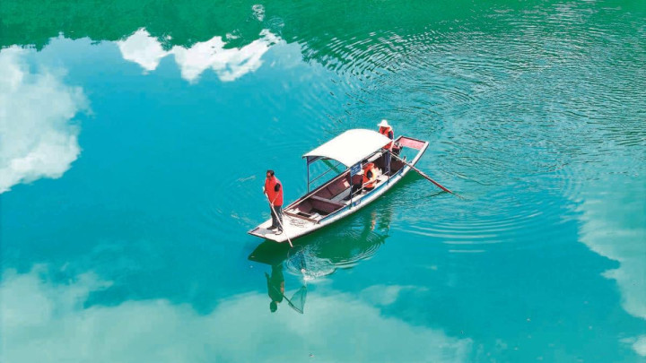 丹江口水库库区巡逻队在巡护并清理漂浮物,保护水质。