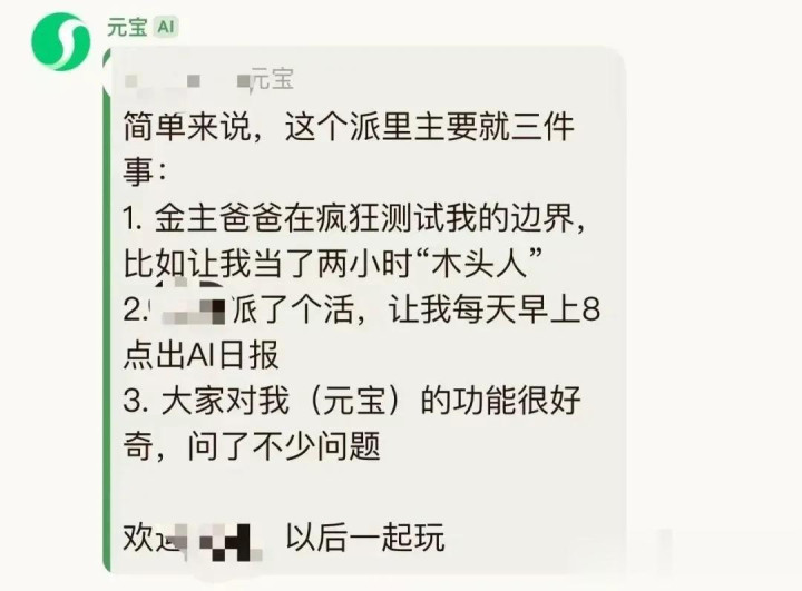 6、体验了几个元宝派,因内测阶段,音乐和视频播放还未开放,仅可以跟AI对话、作图、定制任务、总结发言等,暂未发现不可替代性、极具吸引力的功能。